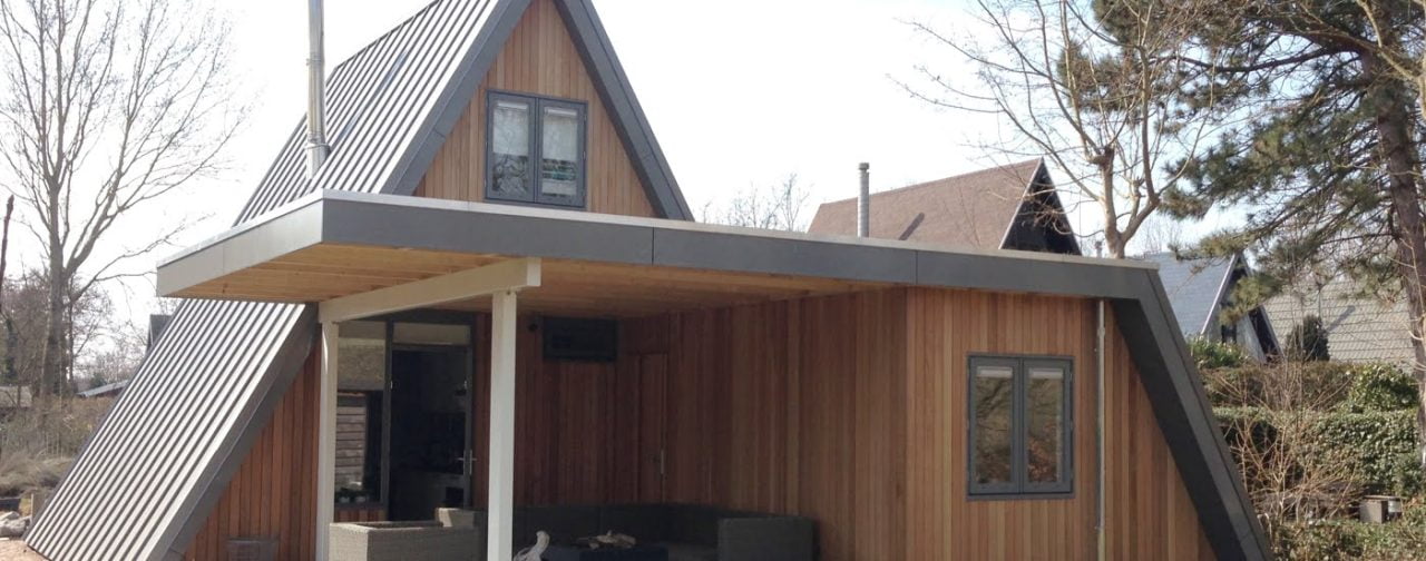 Een standaard vakantiehuis omgetoverd tot een prachtig paleisje. Exclusief en uniek zijn de zinklook dakbeplating en het red cedar open gevel systeem.