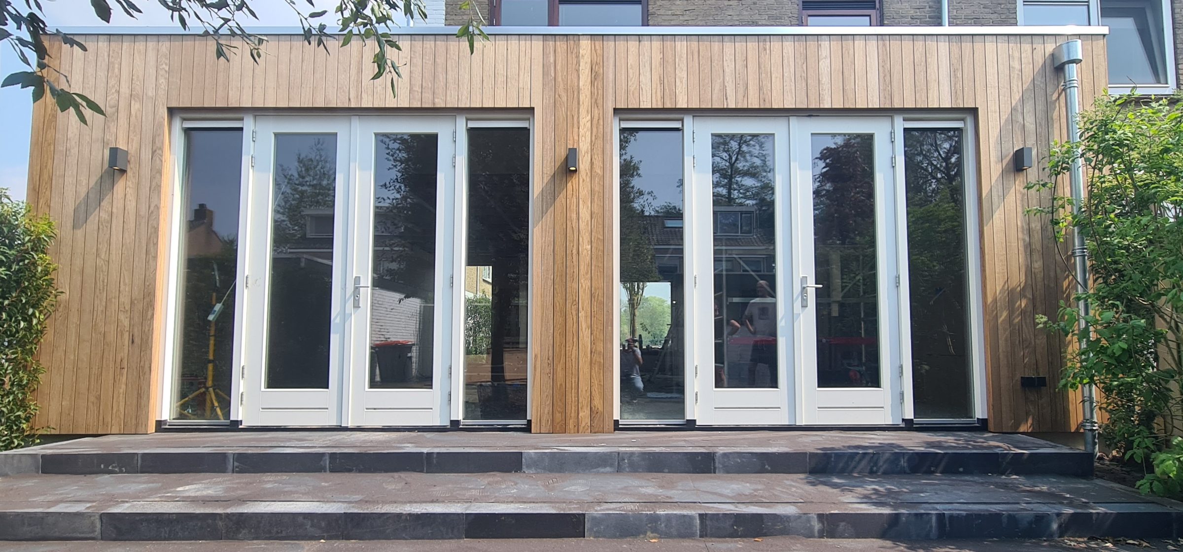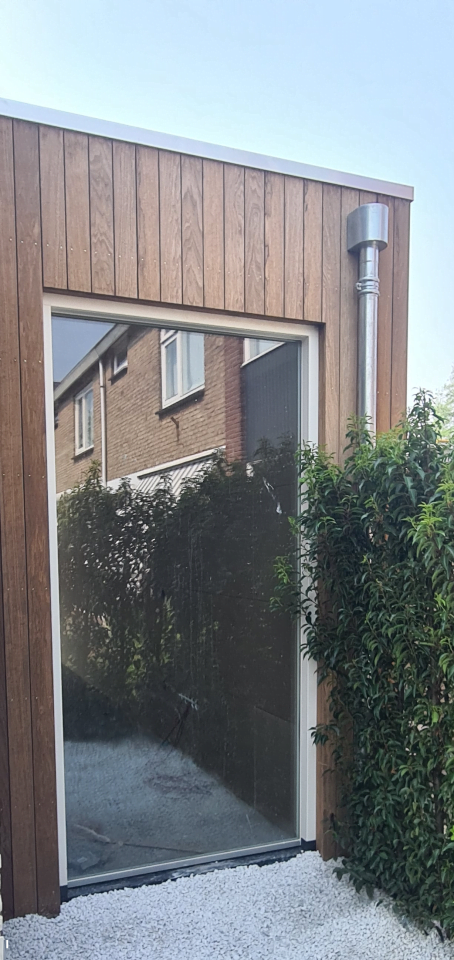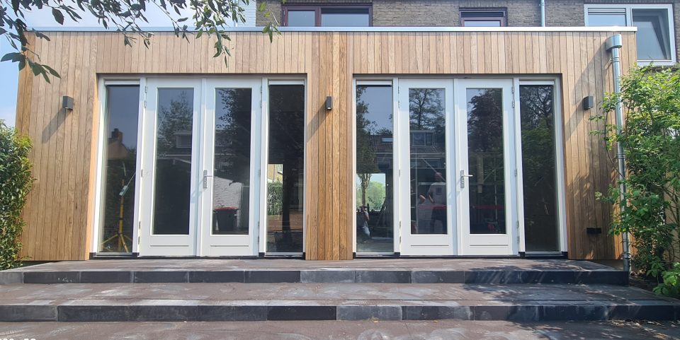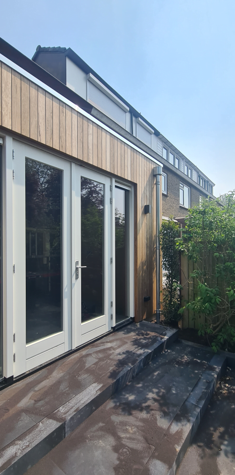 De keuze van het type gevelbekleding bepaald de nieuwe sfeer van de achtergevel. Soms is het beter om te contrasteren met de woning. Het doorgaan in dezelfde stijl kan teveel van hetzelfde zijn. Het contrast zorgt voor een fraaie onderbreking en geeft de woning een geheel nieuwe uitstraling! Er is gekozen voor natuurlijke materialen. De houten gevelbekleding én houten kozijnen vormen samen een mooi geheel. Omdat de onderdorpel met een stukje stijl van een onderhoudsvriendelijk materiaal zijn gemaakt is het kozijn duurzaam. Met goed onderhoud gaat een dergelijk kozijn erg lang mee.