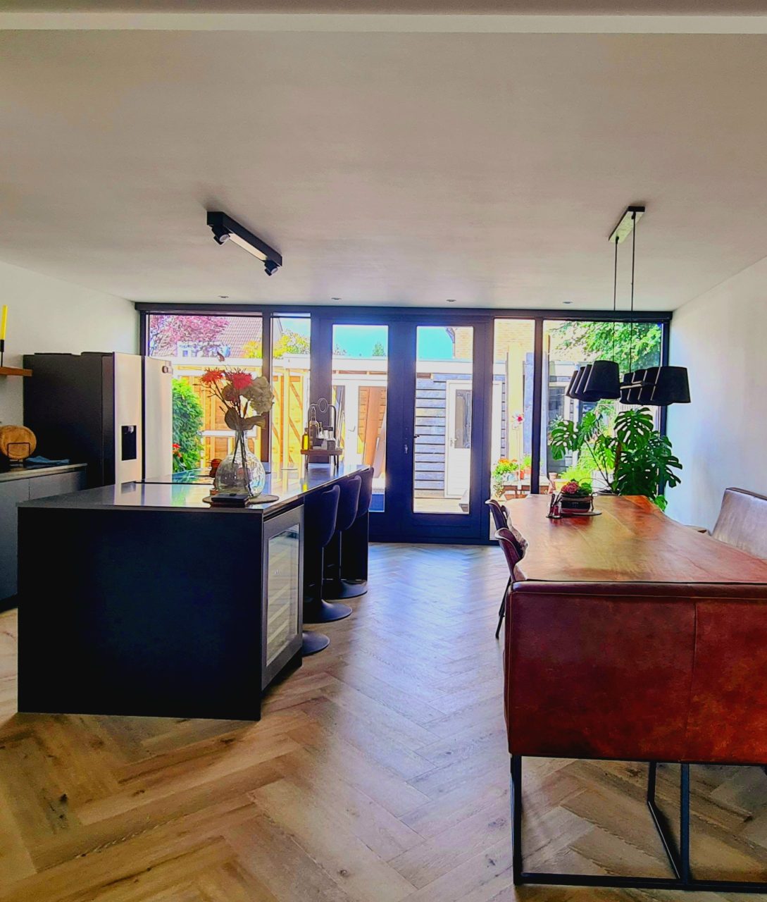 Het effect aan de binnenzijde is verrassend te noemen. De keuken veranderd van een functionele keuken naar een leefkeuken. Het verschil van een gering aantal vierkante meters extra is fors. Natafelen was nog nooit zo leuk.