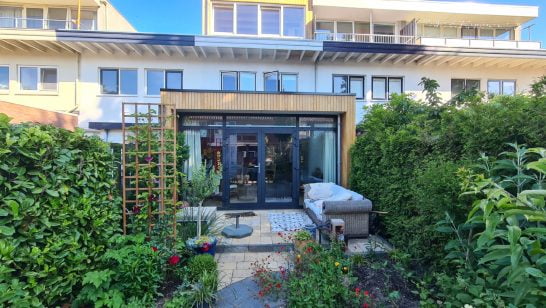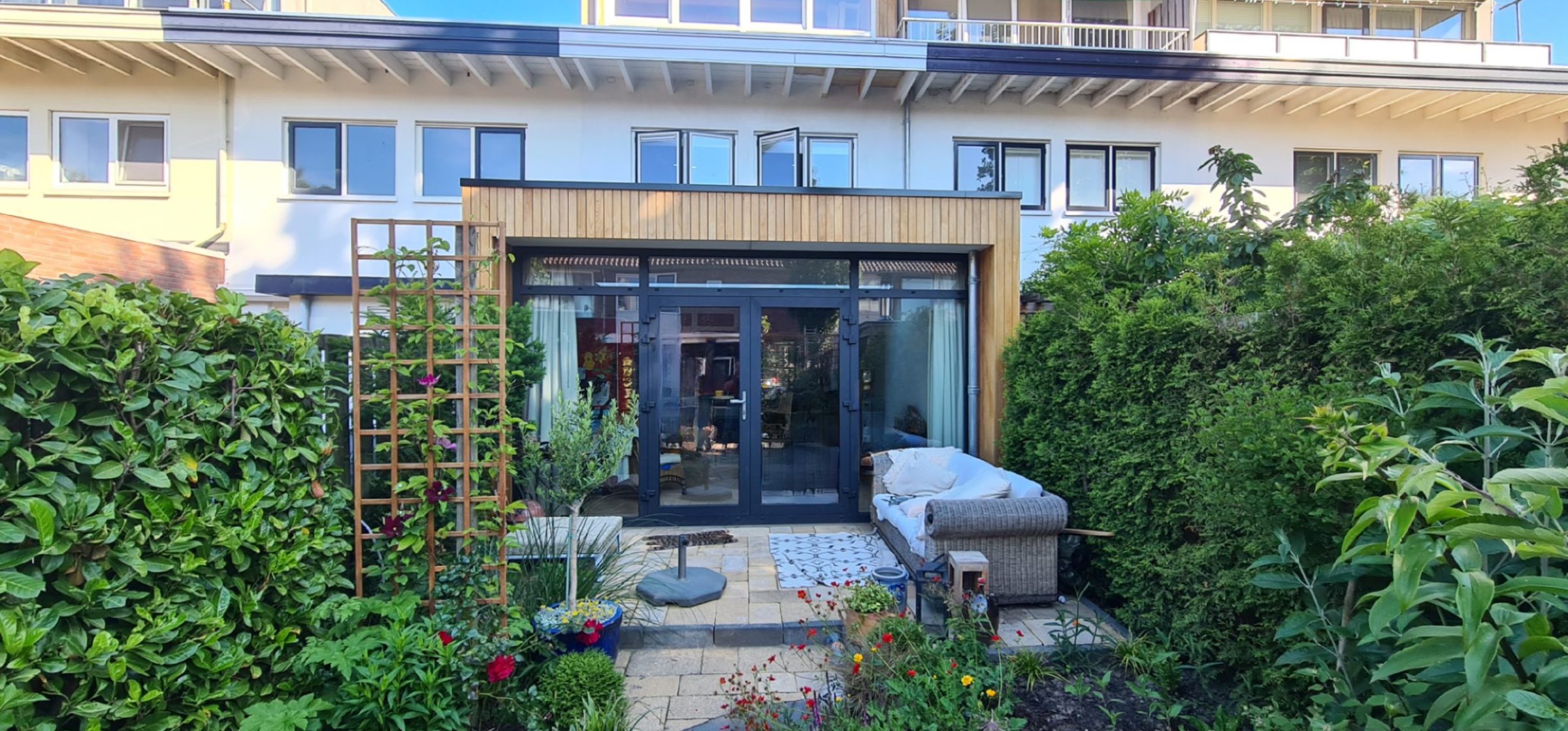 Het aangebrachte kozijn is van aluminium. Dit draagt bij aan de duurzaamheid van deze aanbouw.