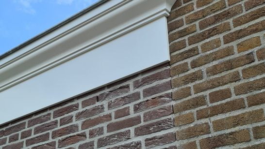 Het boeiboord is voorzien van een op maat gemaakte sierlijst. Vooral de uitwendige hoeken zorgen voor een sierlijk geheel. De zinken kraal met de zinken hemelwaterafvoer zorgt voor de finishing touch.