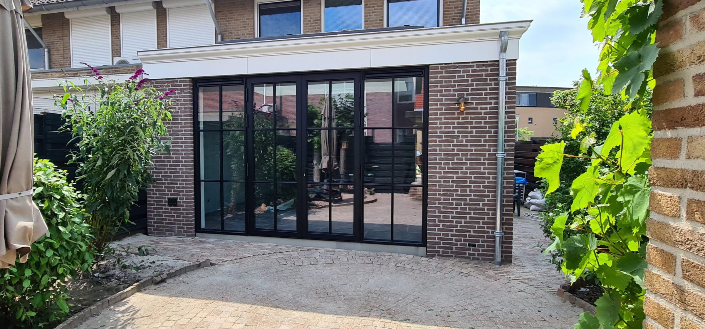 Deze aanbouw is geplaatst in de zomer van 2021. Een aanbouw met allure. Over alles is nagedacht. De gevelkozijnen zijn van zwart gecoat aluminium en voorzien van roedes. Het profiel is een speciaal profiel met een extra ‘neus’ waardoor het een rank uiterlijk krijgt. Ook het hang- en sluitwerk zijn in de kleur van het kozijn gemaakt. Zelfs het glasband in de spouw is uitgevoerd in zwart. Standaard is dit zilverkleurig, maar dat zou gaan glinsteren en opvallen in een zwarte pui.